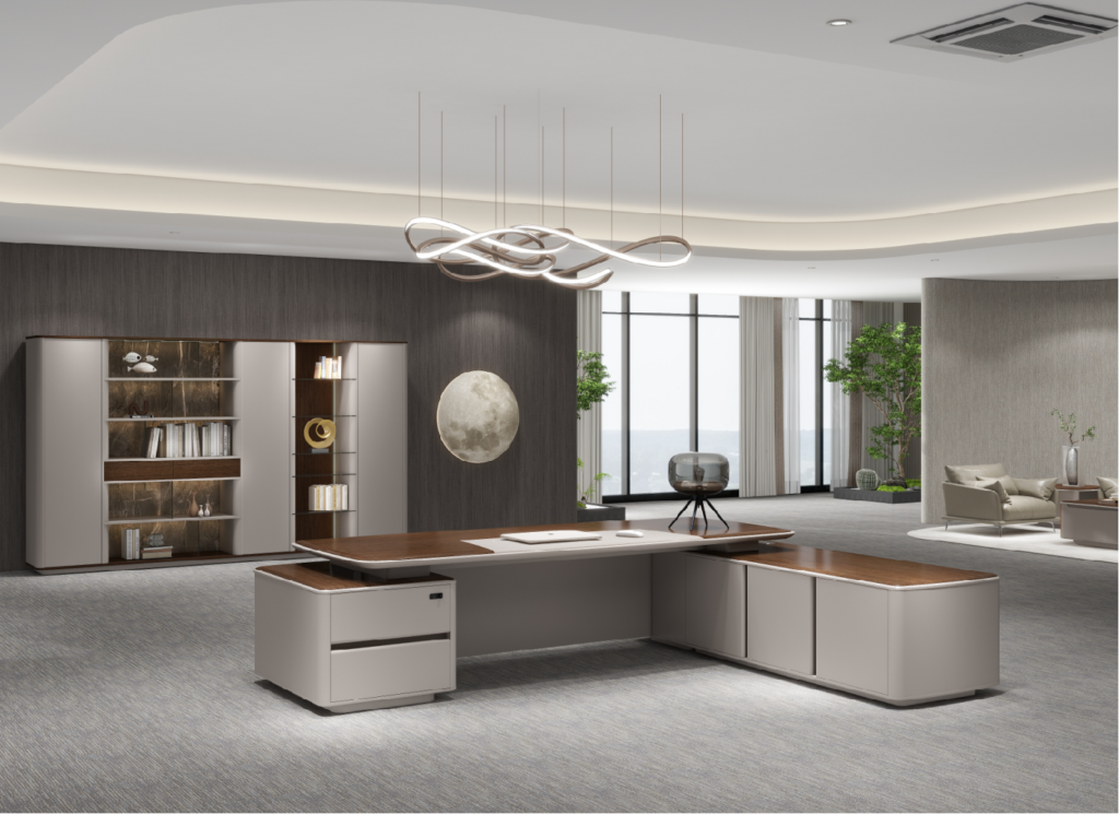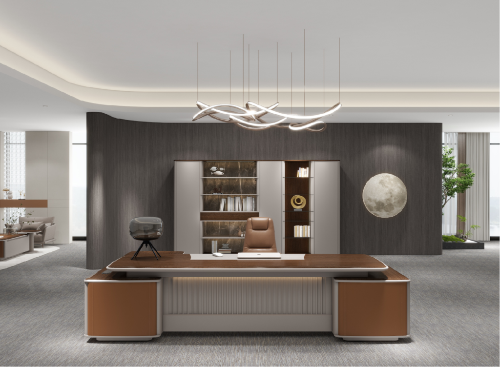 Both the countertop and the attached cabinet top plate adopt a large curved edge design, combined with a dual curved dual color process. Not only do the lines flow smoothly, but they also give the product rich details and three-dimensional sense, helping leaders to work efficiently and think deeply.