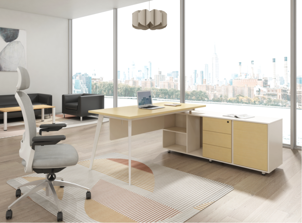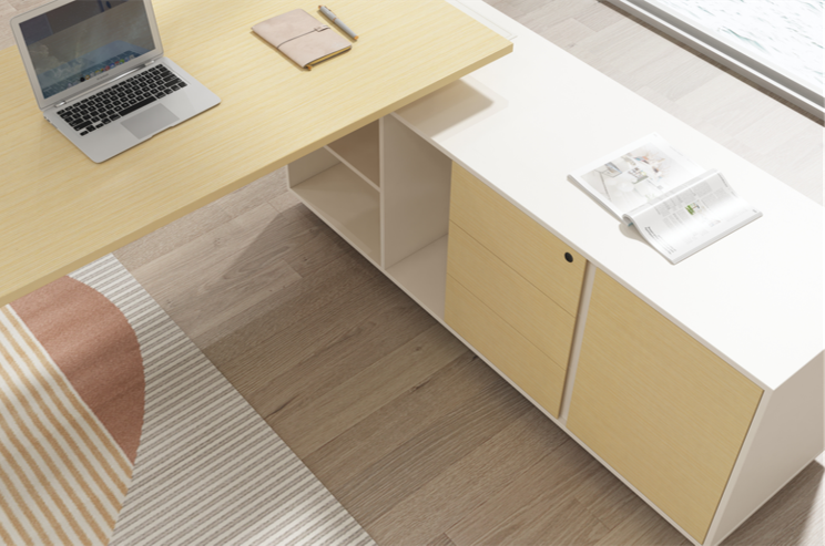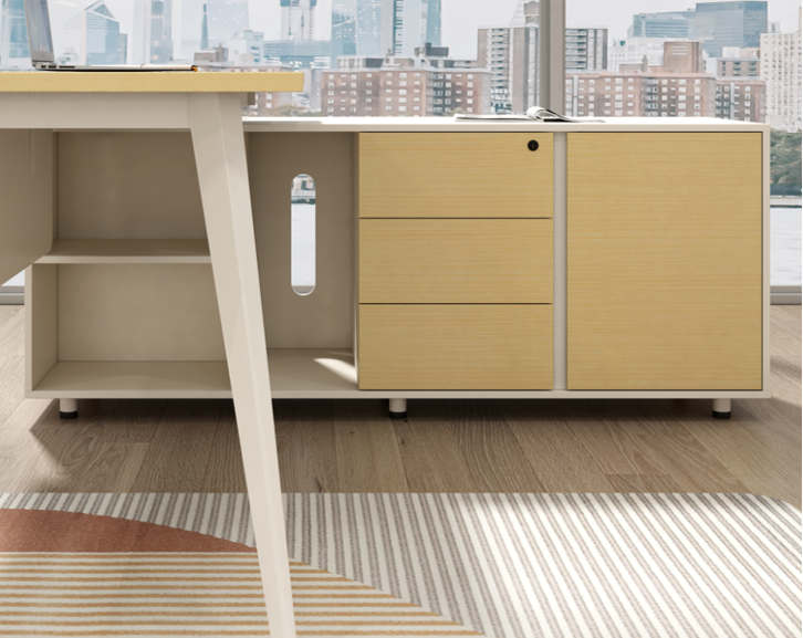 All models use concealed handles, which are clean and tidy overall. The wood and warm white colors give a relaxing feeling and are suitable for different office spaces.